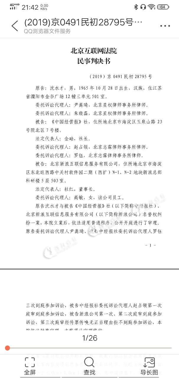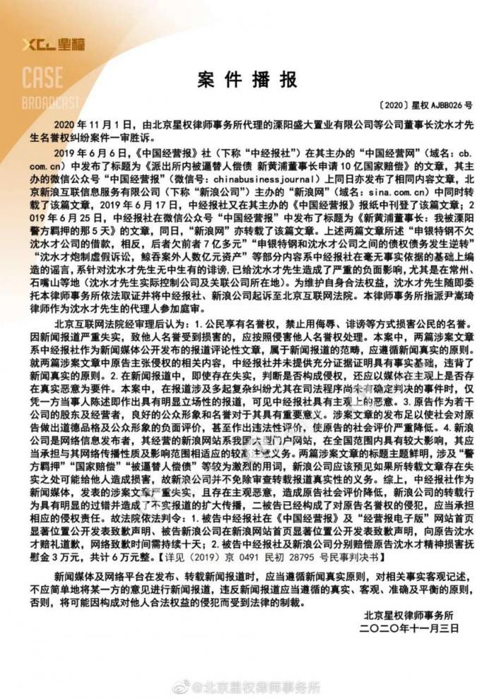 2020年11月1日,由北京星权律师事务所代理的溧阳盛大置业有限公司等公司董事长沈水才先生名誉权纠纷案件一审胜诉。2019年6月,《中国经营报》社在其主办的“中国经营网”(域名:cb.com.cn)、微信公众号“中国经营报”(微信号:chinabusinessjournal)及《中国经营报》报纸中发布多篇文章,其内容中含有大量针对沈水才先生毫无事实依据的诽谤性言论,北京新浪互联信息服务有限公司在其主办的“新浪网”(域名:sina.com.cn)中同时转载相关文章。主审法院依法审理后认定:《中国经营报》社、北京新浪互联信息服务有限公司发布及转载不实文章的行为构成对沈水才名誉权的侵犯,《中国经营报》社、北京新浪互联信息服务有限公司须分别在其主办的报纸、网站首页显著位置公开发表致歉声明,向沈水才赔礼道歉,并分别赔偿沈水才精神损害抚慰金3万元,共计6万元整。