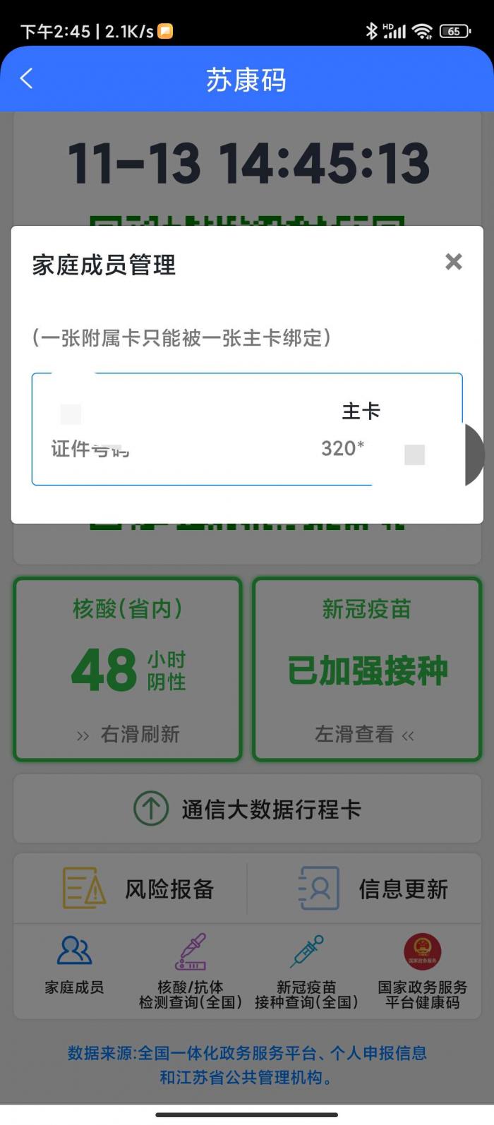 苏康码的家庭成员管理界面,主卡下面是可以添加其他家庭成员的,有个大大的号,现在怎么没有了,因为家里老人以前让别人申请的,但是忘了谁申请的了,现在老人同住,想把健康码绑过来,没地方添加了啊?知道的帮帮忙回复下,谢谢!