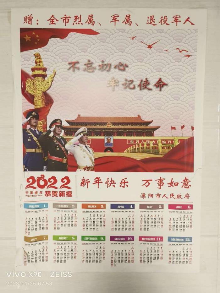 千门万户曈曈日,总把新桃换旧符。望着墙上的赠全市烈属、军属、退役军人老“皇历”,生出些些淡淡的遗憾,二代军人一个现役一个退役,我所在的溧城街道北水西村委会忙得连一张新的年画都不能提供!让人感觉小小的遗憾!