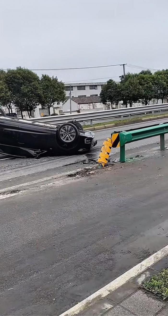 溧阳旧县一辆汽车180度四脚朝天倒在马路上!开车注意安全不是口号!