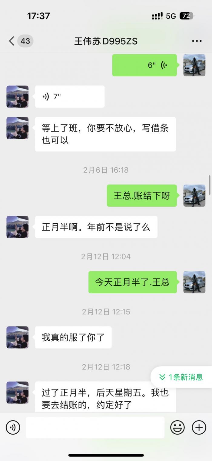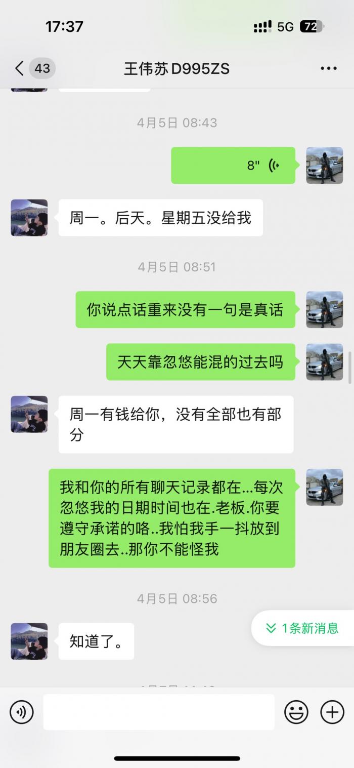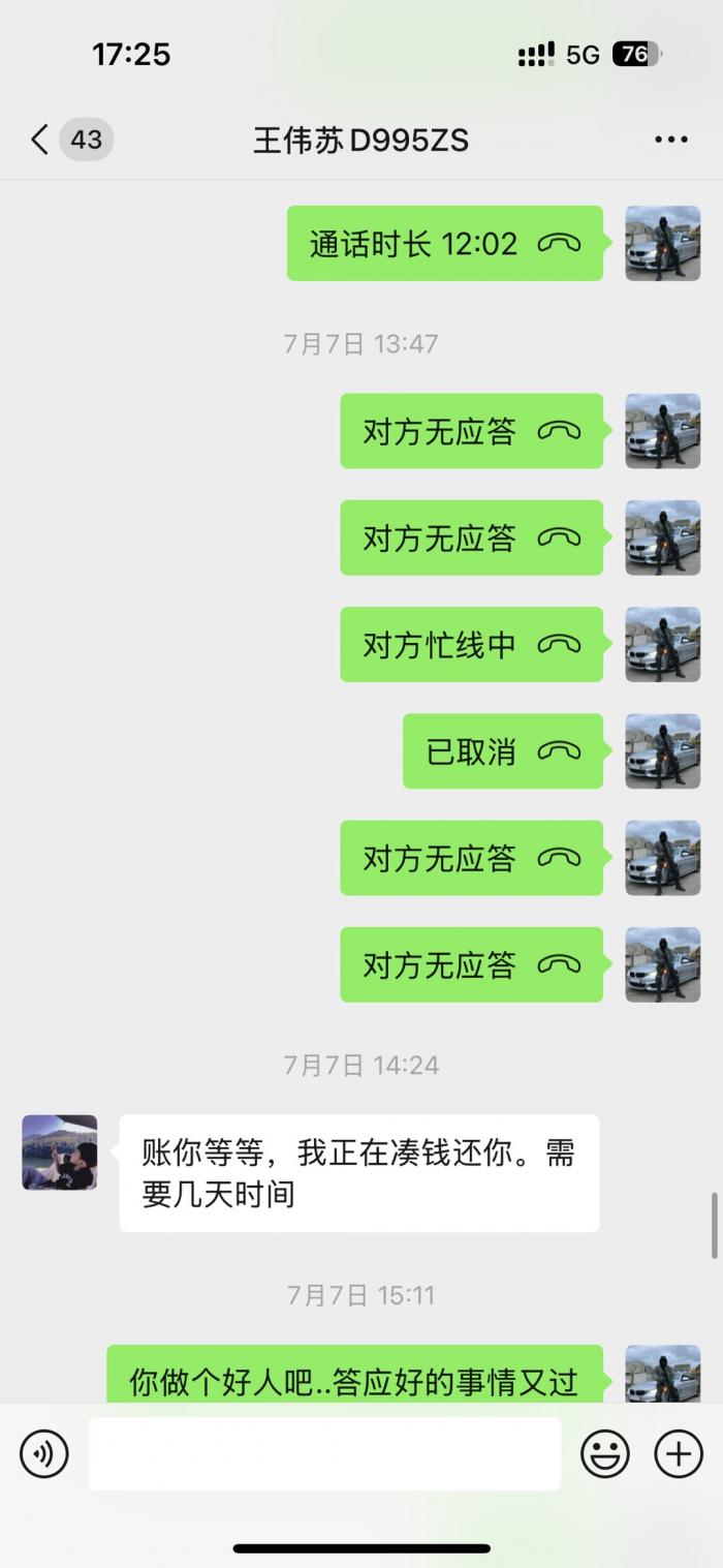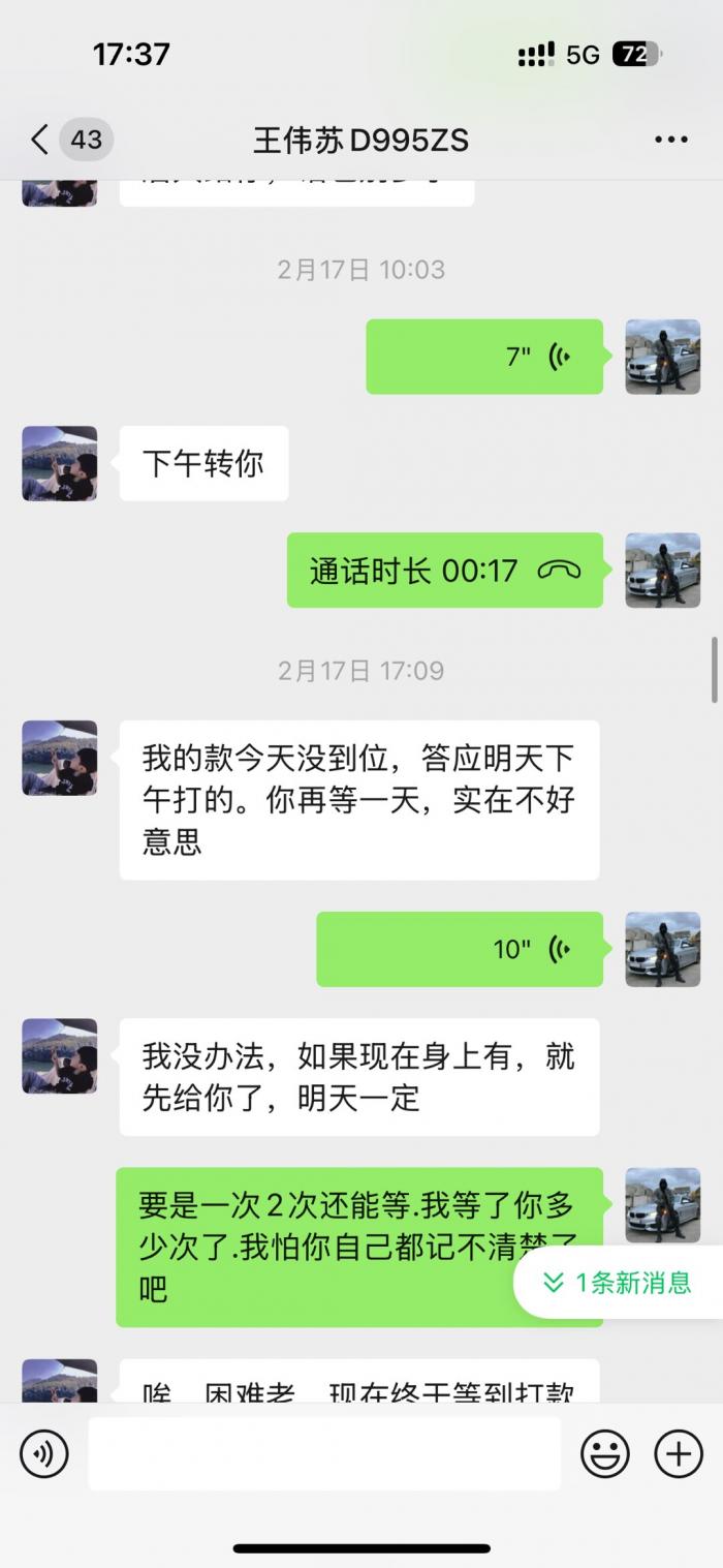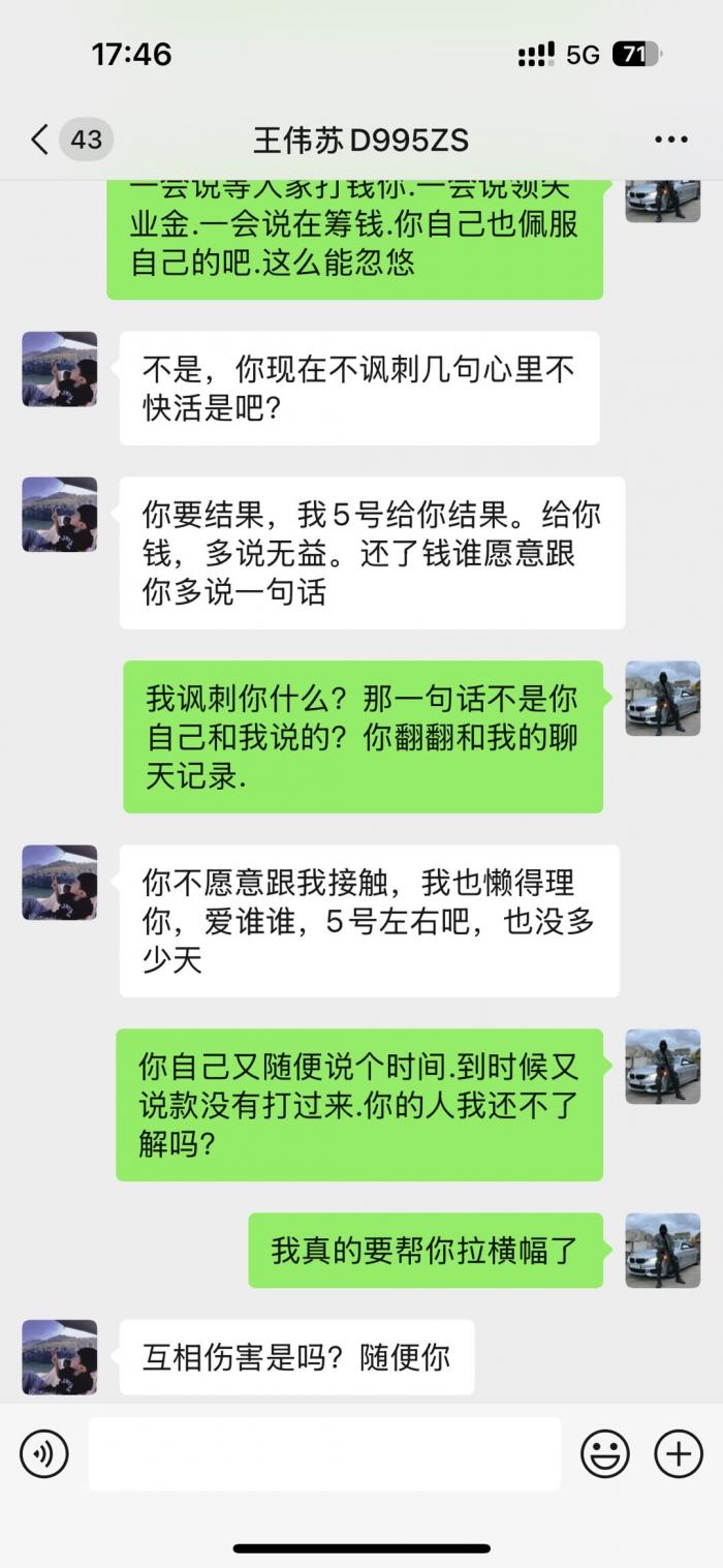 直接看微信截图聊天记录.从2023年底欠我的钱到2025年7月都不还.每次都是说月底.月中.1号.下个星期.次次都是空话.受不了这样的人.这个人到底是神一般的存在。有人认识吗?老家上兴那边的。千万不要和这种人来往。