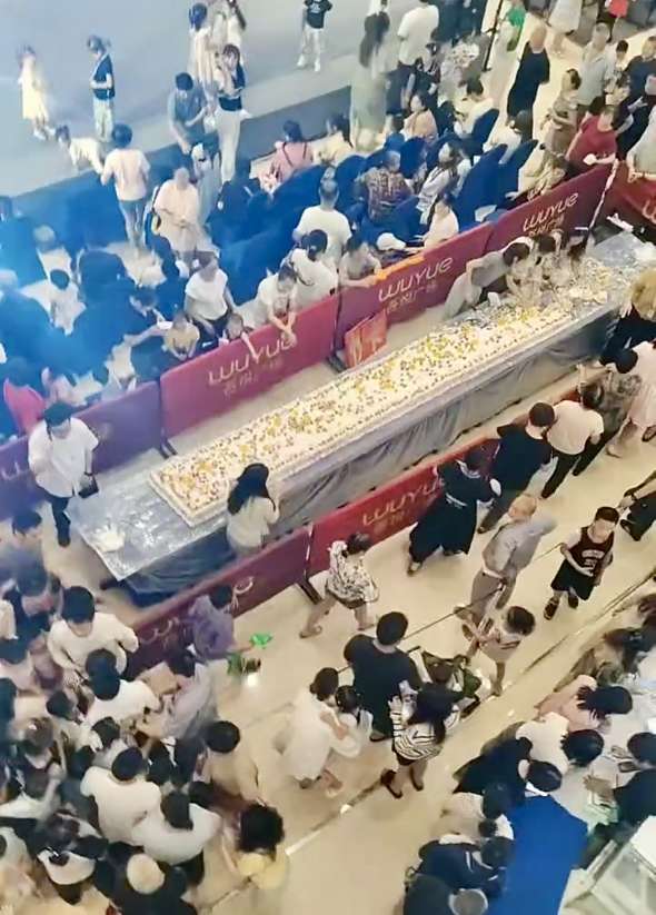 昨天晚上溧阳吾悦广场爆满啦!一楼还摆了个超级长的大蛋糕,这人多的手机屏幕都装不下,队伍排的都望不到头!打听了一下是蛋糕店在做活动,那个大蛋糕可以免费吃的,怪不得那么多人愿意排队呢~