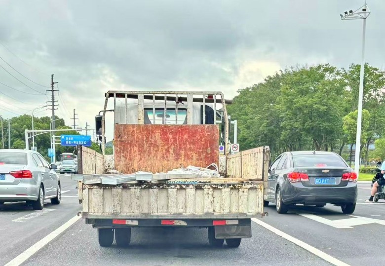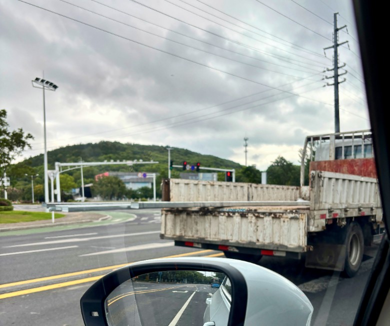 上个礼拜在溧阳一个路口等红绿灯,正好停在了一辆大货车后面,货车上就放了几根长的铁棍子,车厢后面的板子放了下来,当时就感觉这棍子估计戳出来点的,所以很自觉得离他远远的。