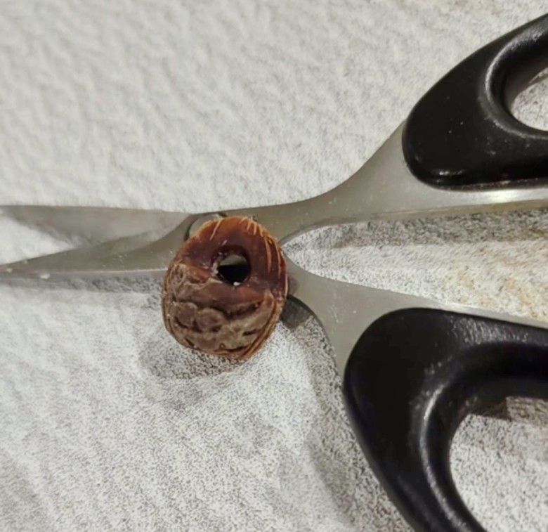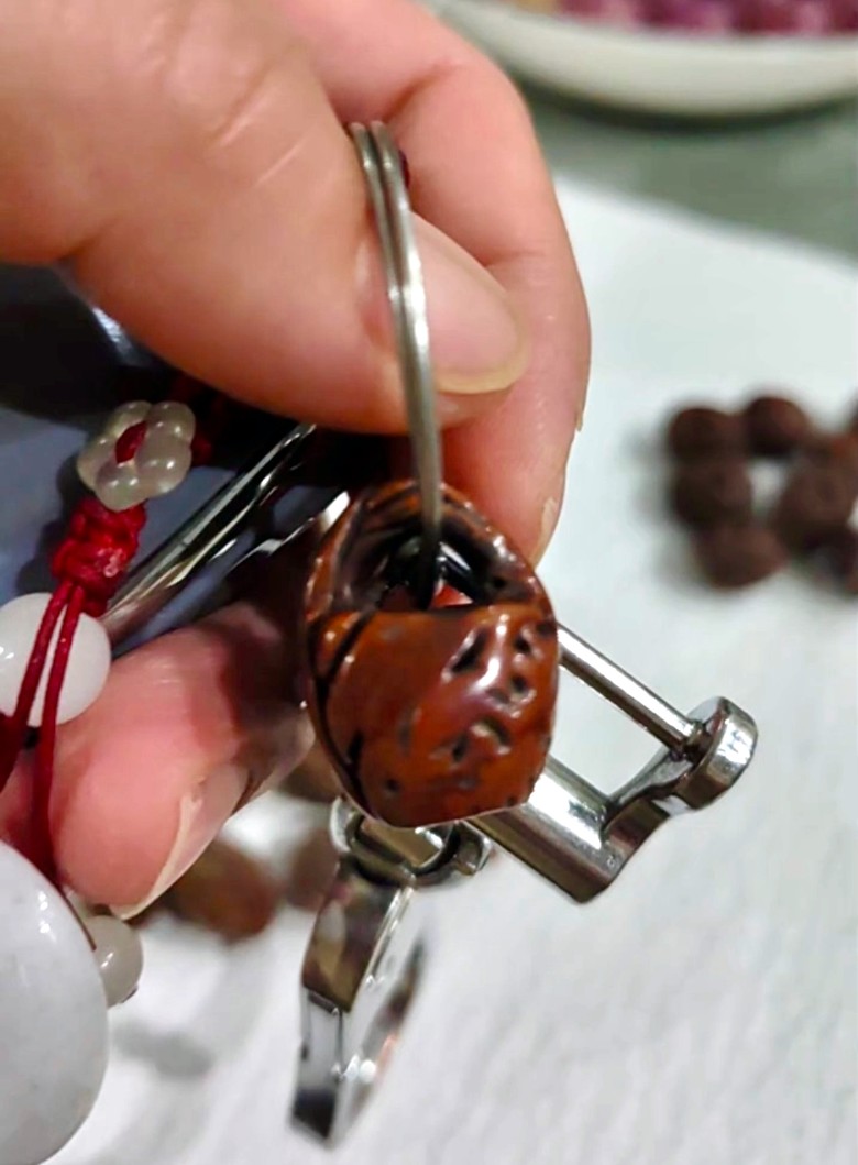 从溧阳山上采来的野桃核,好小好小,一张砂纸,一把剪刀,花了一个多小时,终于搞定了一个,还算有样的,之后再细细打磨吧~我这还是业余的,专业的人有套专门的装备,刻得要精细得多,不过现在有这技术的人可不多了吧?小时候家里大人还把雕刻好的野桃核串了红绳戴在小朋友的手上,现在倒是不多见了。