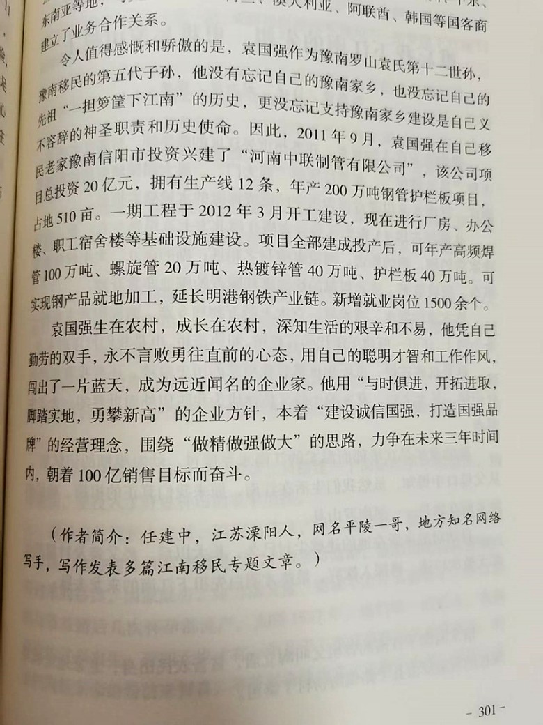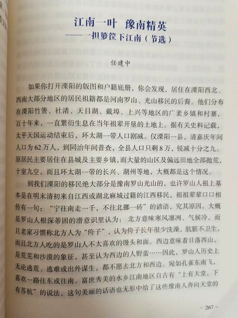 最近,朋友送给我一本厚厚的书,书名叫《罗山移民在江南》,这部35万余字的移民文化书籍,是由河南信阳地区罗山县政协编著的。爱好文学的原罗山县政协主席江力先生负责了本书的撰写、收集、整理工作,豫南移民文化的研究人士、爱好者及后代提供了大量的素材和史料,值得一提的是,溧阳任建中撰写的《江南一叶豫南精英》(节选)约三万字也在本书的第二部分发表。